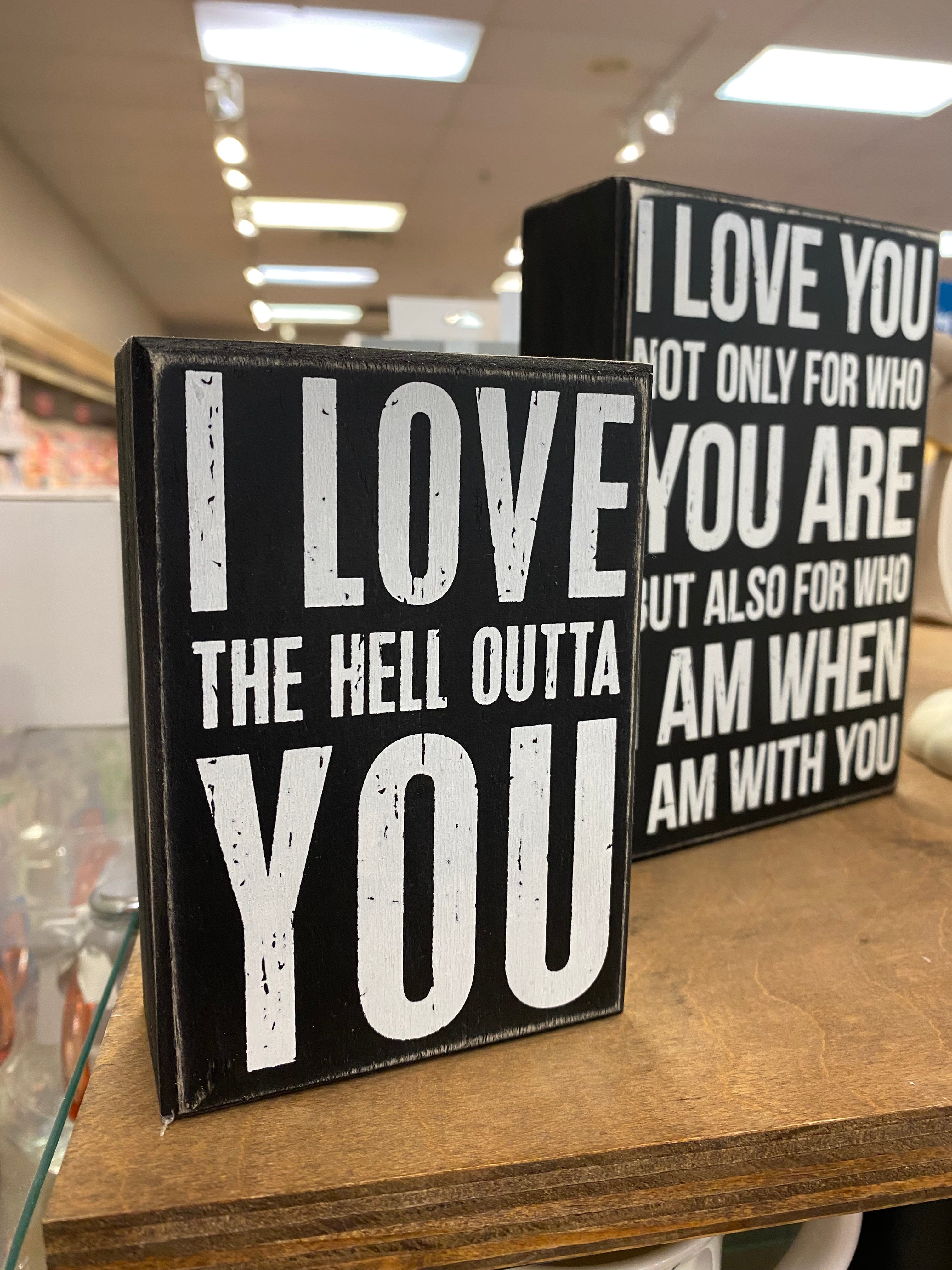 This is a casual phrase that I’ve heard often, but for some reason it struck me differently this time. Maybe it was seeing it in print. Maybe it was the juxtaposition of this phrase next to the one on the wooden block behind it. I’m not sure. Either way, it got me thinking. What does it really mean to love the hell out of someone?